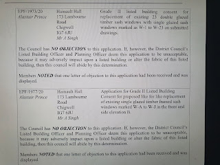 Besides if you look at the leaded windows of the pub which were displayed yesterday, after the ugly wooden boards that have covered this feature of the iconic building, were removed. You will note with some satisfaction that they are still intact and as radiant as ever. I had applied for Historic England to seek listed building status of the Maypole Pub which was rejected, as they felt the historic significance through the unproven link to Dickens was not strong enough. I have since provided evidence of the horse-drawn coach service and London Transport Bus use, a picture taken from Barnaby Rudge mentioning Chigwell Row and an image of the leaded windows. I can think of no other location in Chigwell Row that has such distinctive windows - barring All Saint's Church of course. The leaded windows seem to have piqued Historic England's interest along with the other data and I hope this will change their focus. Even if these details make credible a listing of the building, we may still have to await a planning application submission, before action is taken.