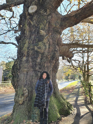 Hannah Chowdhry seeking protection from the cold, standing by the beautiful Charles Dickens Oak.